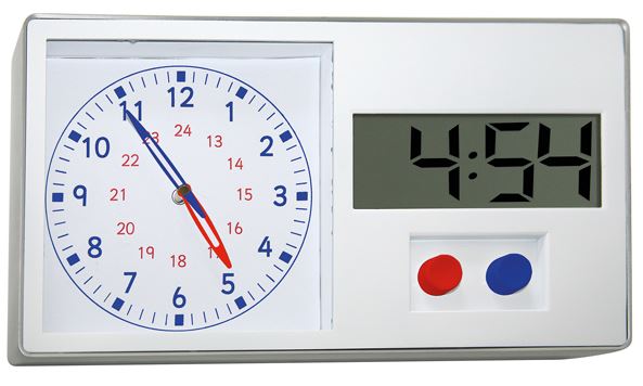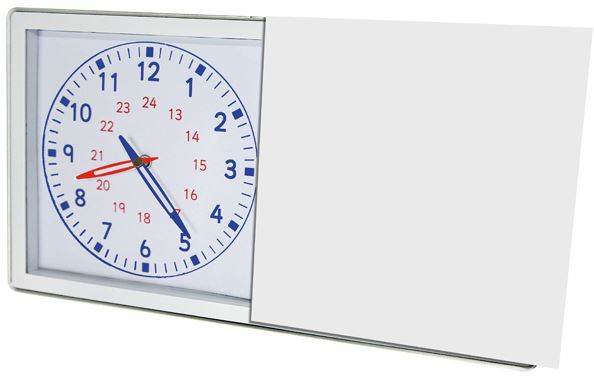 Leeruurwerk digitaal en analoog. 1 kant kan afgeschermd worden om zowel digitale als analoge klokken te leren lezen. Je kunt de leerklok op een tafel zetten of aan de muur hangen. Werkt op 2 AA-batterijen niet meegeleverd. Afmetingen: 39,5 x 21 x 4 cm.