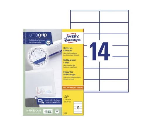 Doos 100 vel universele etiketten Avery. 105x41mm. 14 etiketten per vel. Wit.