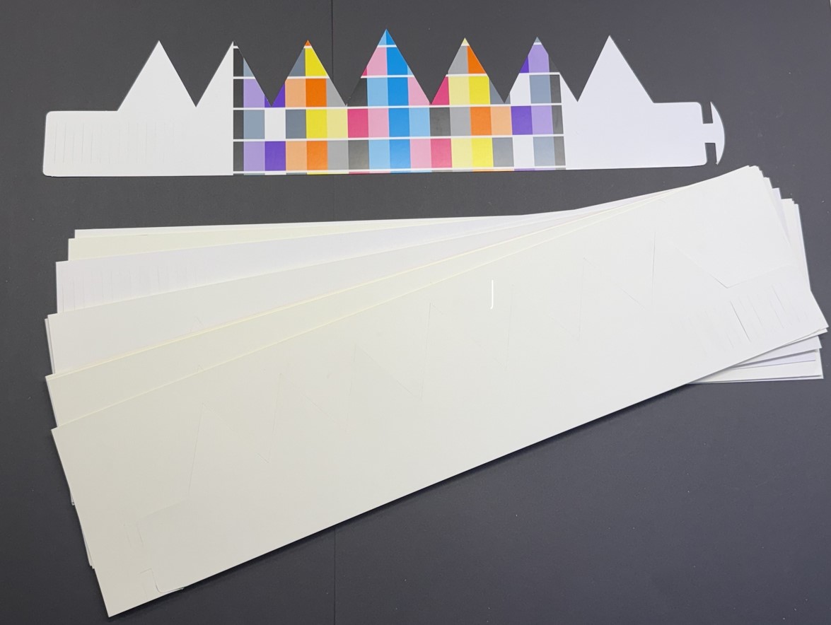 Pak 25 aanpasbare kronen 62X14cm. Opgelet: 1 zijde te versieren, mogelijks gedeeltelijk bedrukt aan andere kant. Ideaal om zelf toffe kronen te versieren. Circulaire afkomst van restpartijen uit b.v. drukkerijen. In samenwerking met maatwerkbedrijf Blankedale.