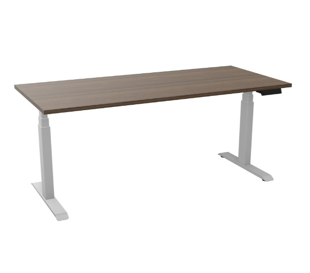 Axel 2 rechth. bur B. 180 x D. 80 cm - Voorgeboord vr kabeldoppen -Elektrische hoogteregeling - Blad dikte 25 mm in bruin notelaar melamine - onderstel zilver grijs glad metaal - 4 gebruikers x 2 memory + USB