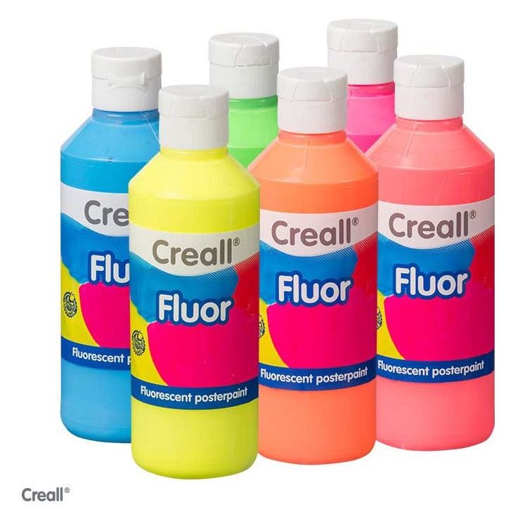 6 fluoverf 250 ml assorti. fluorescerende plakkaatverf op waterbasis, door extra veel pigment fel oplichtende kleuren, na droging mat, voor optimale bescherming, aflakken met Creall Varnish