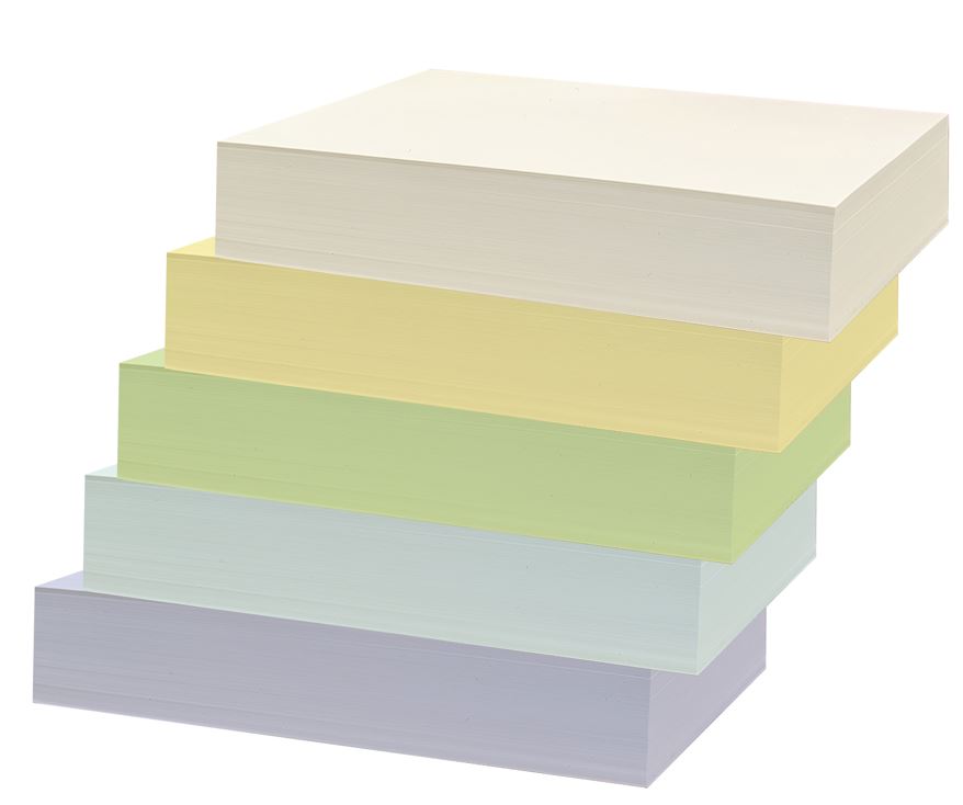 Pakket met 5 pakken van elk 500 vellen kopieerpapier A4 – 80g - assortiment pastelkleuren: lavendelpaars, lichtblauw, lichtgroen, lichtgeel, ivoor.