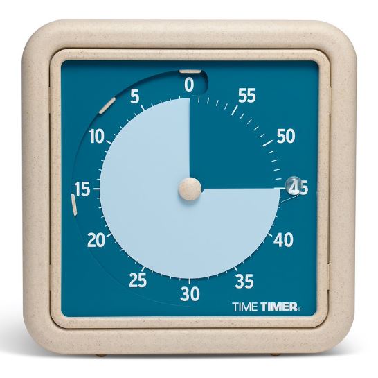 Middelgrote visuele timer van 60 minuten 19 cm x 19 cm x 3 cm. Met 45% minder plastic, gemaakt van rijstkaf. 45% lichter. Voor 1 AA batterij, niet inbegrepen. Blauw