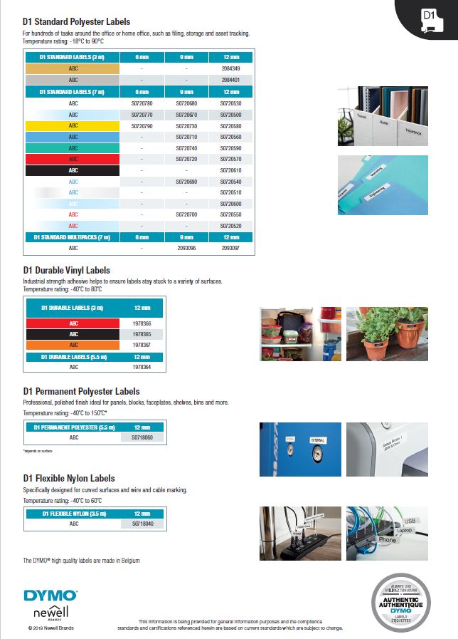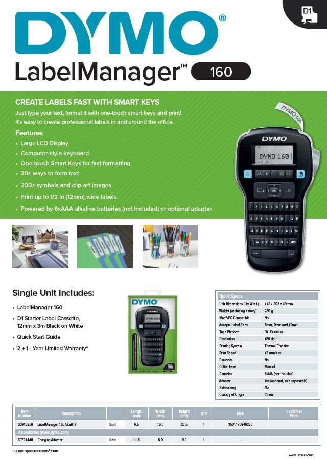 Maak uw tekst snel op dankzij met één toets bediende sneltoetsen voor vet, cursief, onderstrepen, tekstgrootte en verticale tekst. Printvoorbeeld op groot LCD-display. Kies uit 6 lettergroottes, 8 tekststijlen, 4 kaders en onderstrepen. Geef uw labels een professioneel uitzicht en meer duidelijkheid met behulp van 228 symbolen en clipartafbeeldingen; gebruik de sneltoetsen om valutasymbolen en andere veelgebruikte symbolen in te voeren. Verlengde levensduur van de batterijen dankzij de automatische uitschakelfunctie die de labelmaker uitschakelt wanneer hij niet gebruikt wordt. Druk met behulp van de geheugenfunctie het laatste label opnieuw af zonder alles opnieuw te typen. Voeding: 6 AAA-batterijen niet meegeleverd of een optionele AC-adapter afzonderlijk verkrijgbaar. Voor DYMO D1-labels met een breedte van 6mm, 9mm en 12 mm. Azerty