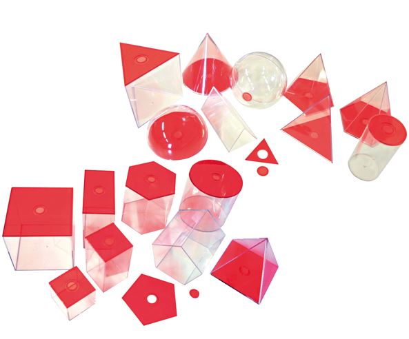 Set van 17 transparante 3D-figuren met rood deksel uit acryl. De rode deksels geven aan aan welke kant de lichamen geopend moeten worden. Ze bevorderen de ruimtelijke verbeelding en moedigen experimenten aan. Vloeistoffen, zand... kunnen worden gevuld om gewichten en volumes te meten. Hoogte: 10 cm. Lerarenset.