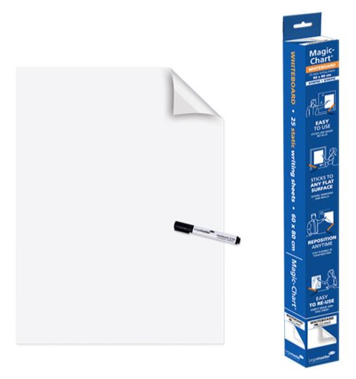 Rol 25 vel Magic Chart Whiteboard 60x80cm - Elektrostatische folie blijft aan praktisch ieder oppervlak plakken hout, beton, glas, behang. Geen plakmiddel nodig, laat geen sporen achter. Vellen kunnen gemakkelijk verplaatst worden.