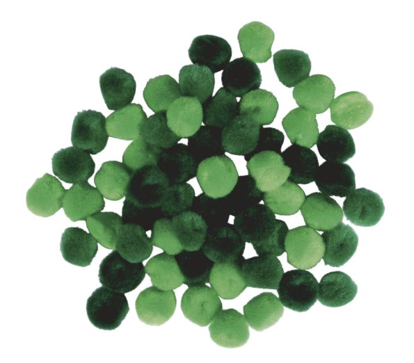 Zakje met 60 groene pompons. Leuk product om mee te knutselen en allerlei vormen en materialen te beplakken. Diameter pompons: 15 mm. Materiaal: 100% polyacryl.