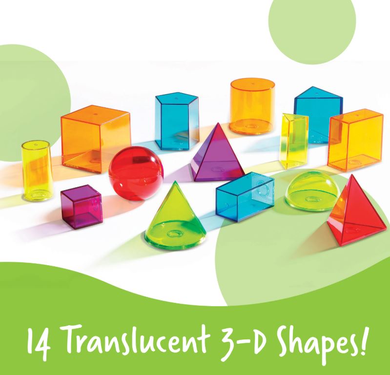 Set 14 geometrische 3D figuren uit transparante kunststof. De grootte van de figuren varieert tussen 3 en 6 cm. In 6 aantrekkelijke kleuren en 14 verschillende vormen. Leeftijd: 8+