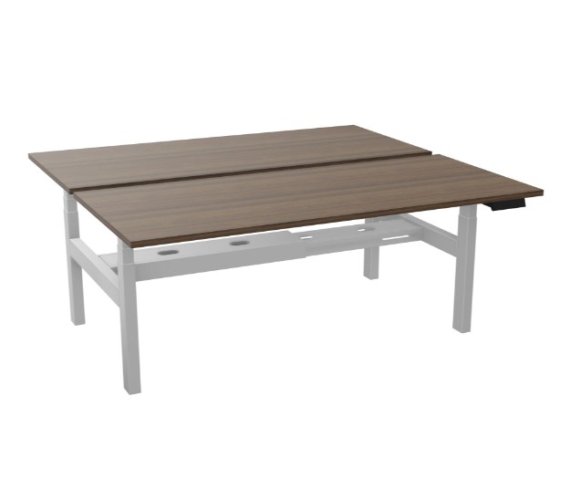 Axel 2 bench bureau B. 180 x D. 80 cm - Elektrische hoogteregeling - Blad dikte 25 mm voorgeboord voor 2 kabeldoppen in bruin notelaar melamine - onderstel zilver grijs glad metaal - 4 gebruikers x 2 memory + U