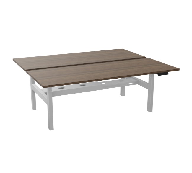 Axel 2 bench bureau B. 200 x D. 80 cm - Elektrische hoogteregeling - Blad dikte 25 mm voorgeboord voor 2 kabeldoppen in bruin notelaar melamine - onderstel zilver grijs glad metaal - 4 gebruikers x 2 memory + U