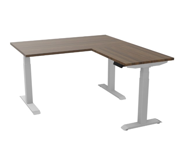 Axel 2 rechth. bur B. 140 x D. 80 cm met aanbouw B. 80 x D. 60 cm -Elektrische Hoogteregeling - Blad dikte 25 mm in bruin notelaar melamine - onderstel zilver grijs glad metaal - vierkantig poot 75x75 mm - 4 ge
