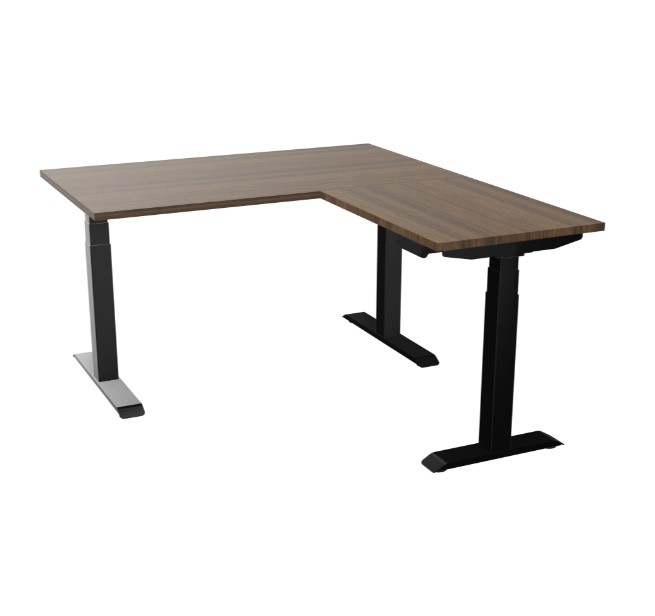 Axel 2 rechth. bur B. 140 x D. 80 cm met aanbouw B. 80 x D. 60 cm -Elektrische Hoogteregeling - Blad dikte 25 mm in bruin notelaar melamine - onderstel zwart glad metaal - vierkantig poot 75x75 mm - 4 gebruiker