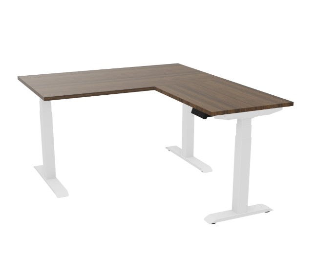 Axel 2 rechth. bur B. 140 x D. 80 cm met aanbouw B. 80 x D. 60 cm -Elektrische Hoogteregeling - Blad dikte 25 mm in bruin notelaar melamine - onderstel wit glad metaal - vierkantig poot 75x75 mm - 4 gebruikers