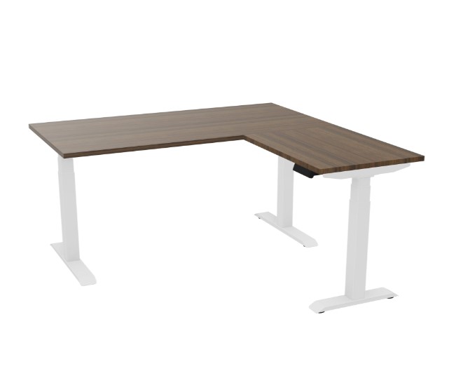 Axel 2 rechth. bur B. 160 x D. 80 cm met aanbouw B. 80 x D. 60 cm -Elektrische Hoogteregeling - Blad dikte 25 mm in bruin notelaar melamine - onderstel wit glad metaal - vierkantig poot 75x75 mm - 4 gebruikers
