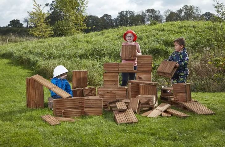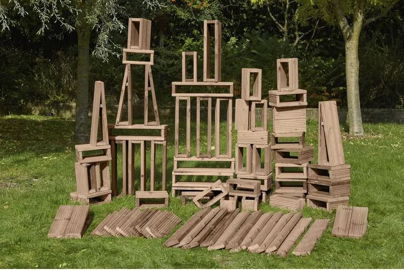 Duurzame houten bouwblokken voor buiten die kinderen echte architecten maken. Ideaal voor scholen en opvang: stimuleren creativiteit, fantasie en actief spel. Pakket 75 houten bouwblokken voor buiten. Voor 3 jaar en ouder. 51 diverse blokken en 24 planken. Plank: L1,2 m - Vierkant: L26 cm x H14 cm – Hellende blok: L56 cm x H14 cm - Grote rechthoek: L56 cm x H14 cm - Kleine rechthoek: L28 cm x H14cm.