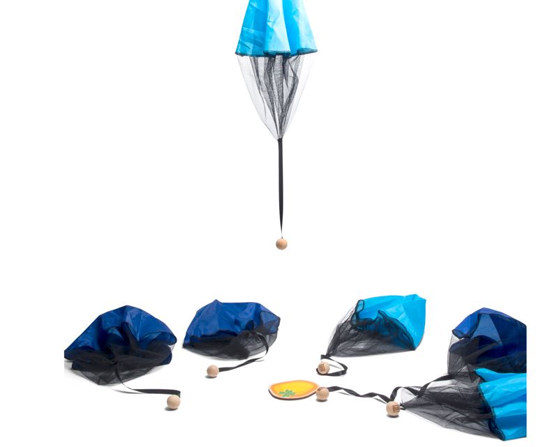 Lanceer de parachutes en probeer je boules zo dicht mogelijk bij het eiland te krijgen. 6 parachutes, 1 eiland 10x9x0,5cm en een touw van 1m. Grove motoriek, competitieve uitdaging en strategisch denken. Vanaf 6 jaar.