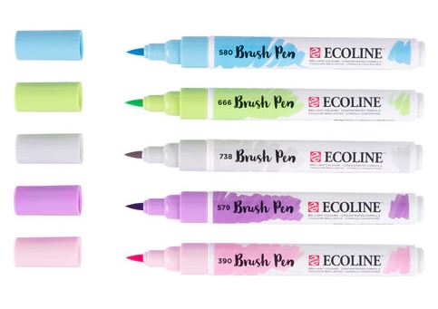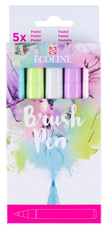 Pak van 5 ecoline brush pen pastel. De droogtijd is korter dan bij andere aquarelpenselen, maar de hoogwaardige, gepigmenteerde kleurinkt blijft behouden.